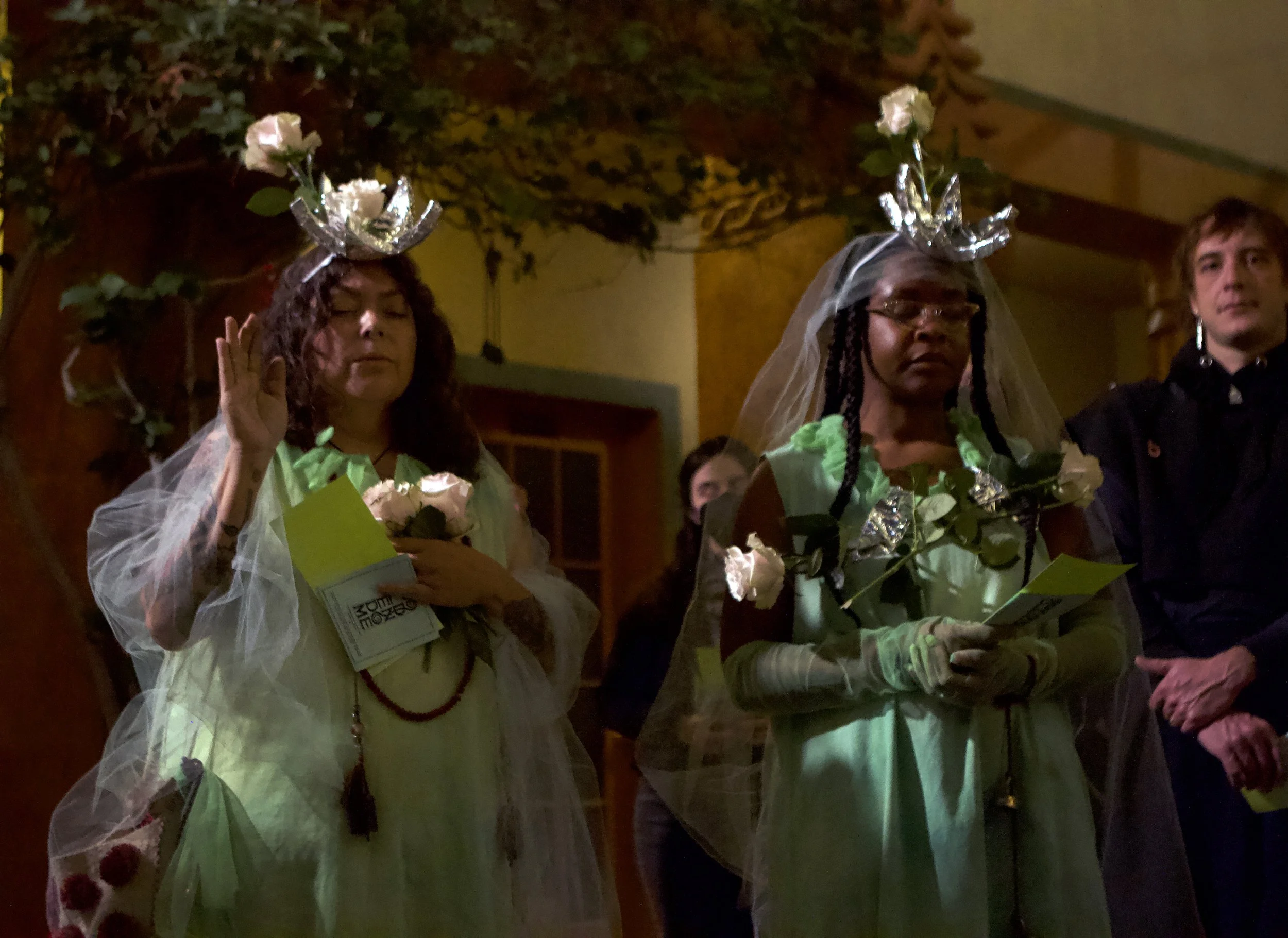 Since its beginning, the ceremony has evolved organically, shaping itself around an opening prayer devised by Edgar Fabián Frías—an invocation of the Goddexx of Love that helps set the tone for each gathering. Participants often contribute to the ceremony through processions, hand-dyed garments, flowers, and vessels for water blessings, creating a shared visual and emotional landscape.